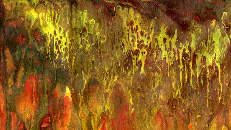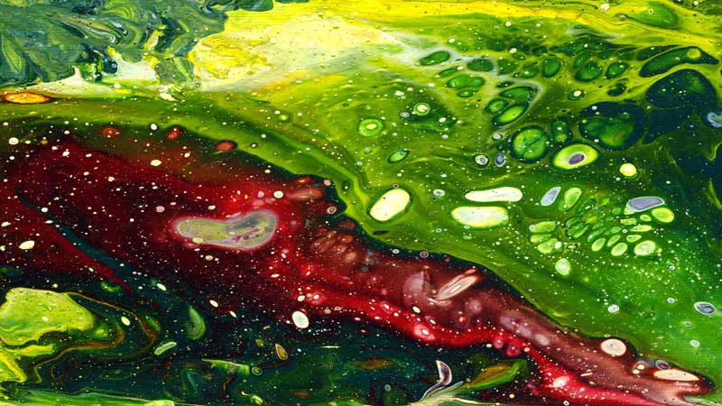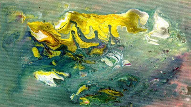 These images were created by using pouring medium and/or kitchen oil mixed with acrylic paint. They were digitally modified to create the compositions below. A selection of acrylic pourings subsequently had their luminance values extracted and the data used to create horizontal displacements in order to generate stereoscopic, 3D imagery for projection and even to be viewed in 360 degree, 3D virtual reality. They are spectacular writ large and totally immersive in VR. Some were turned into animated, 3D kalaidoscopes.