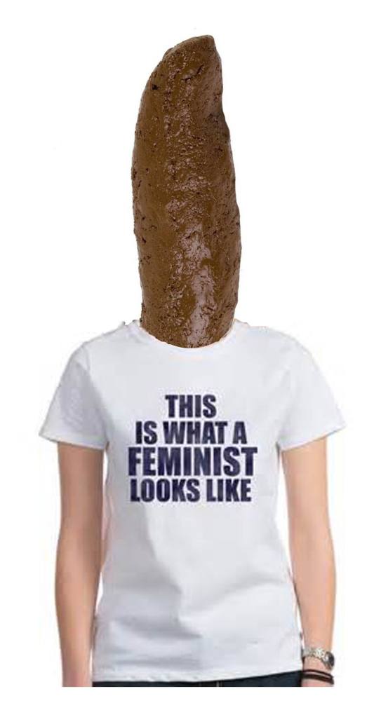 The concept is simple – a merging of but two images to completely alter the meaning of the slogan on the shirt. The original slogan is intended to browbeat men into the realisation that they are supposedly surrounded by feminists but once you have seen this image, no tee-shirt bearing this slogan is ever going to seem the same. “Shit in a Shirt” has demolished the original message and reduced it to absurdity.